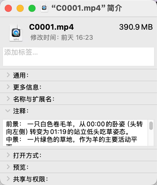 "/Users/.../C0003.MP4","video","前景:卧地的成年绵羊与三只小羊羔...","11.52","1920x1080","16:9"
